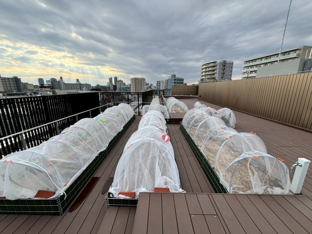 (写真の中央と左側が防虫ネット+寒冷紗です!