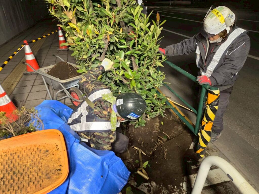 夜間の剪定および植栽作業を行いました。