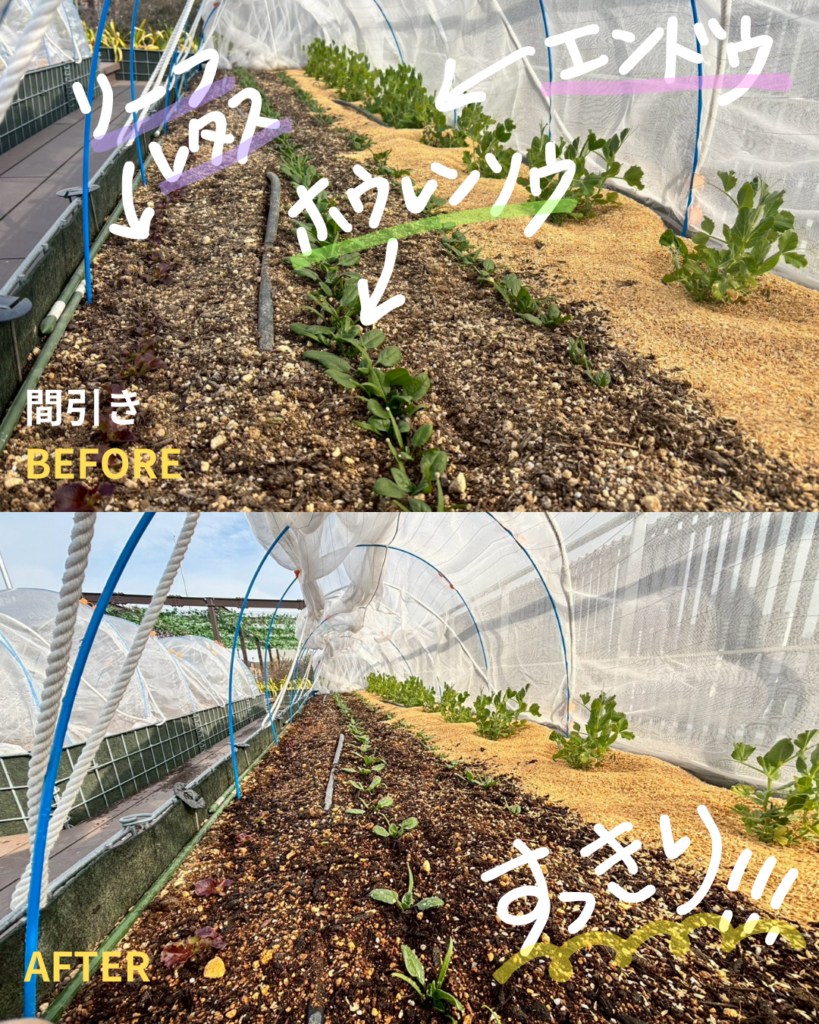 (間引き作業とは…野菜が元気に育つように、混み合った芽を減らす作業です🥬)