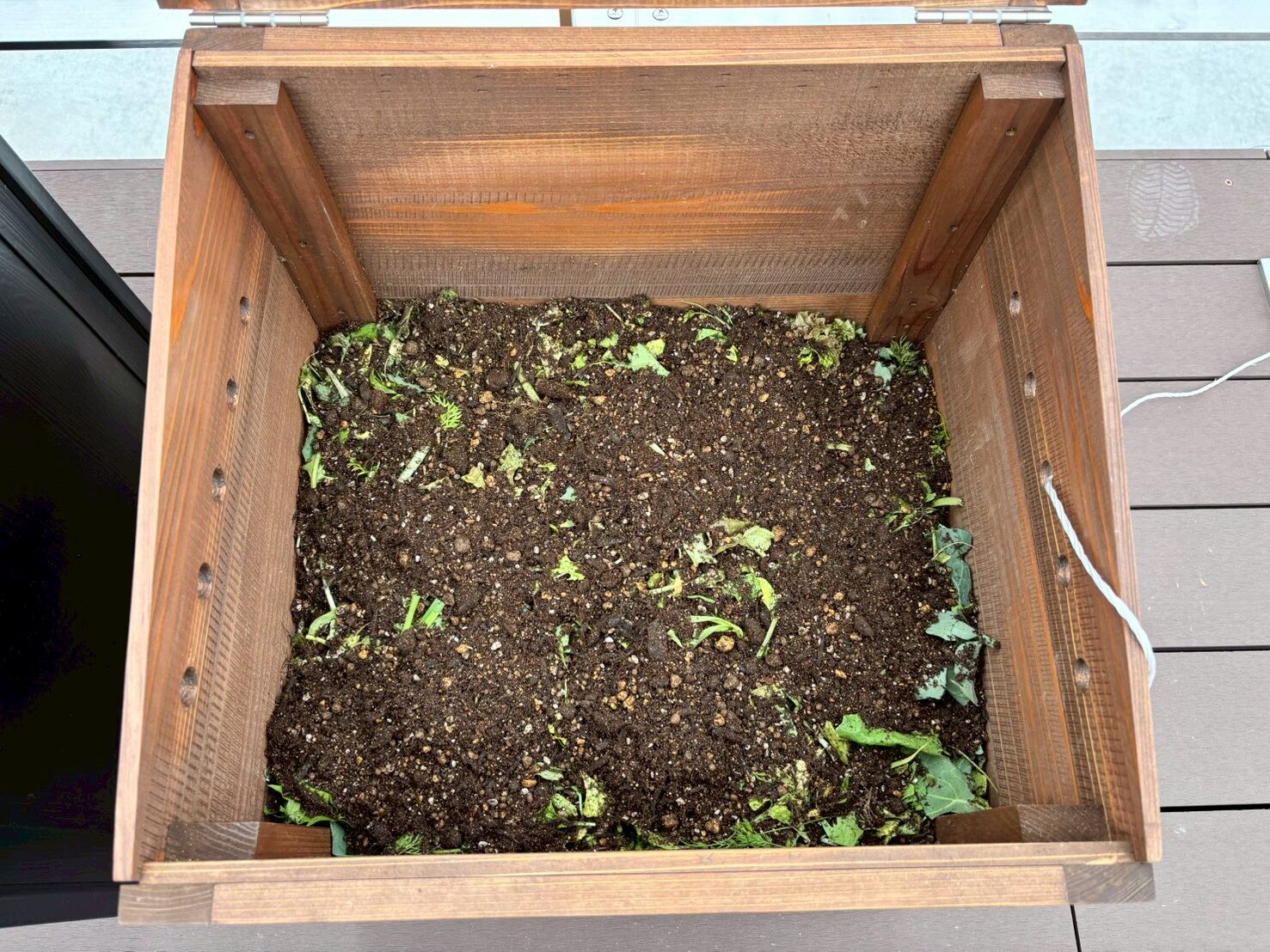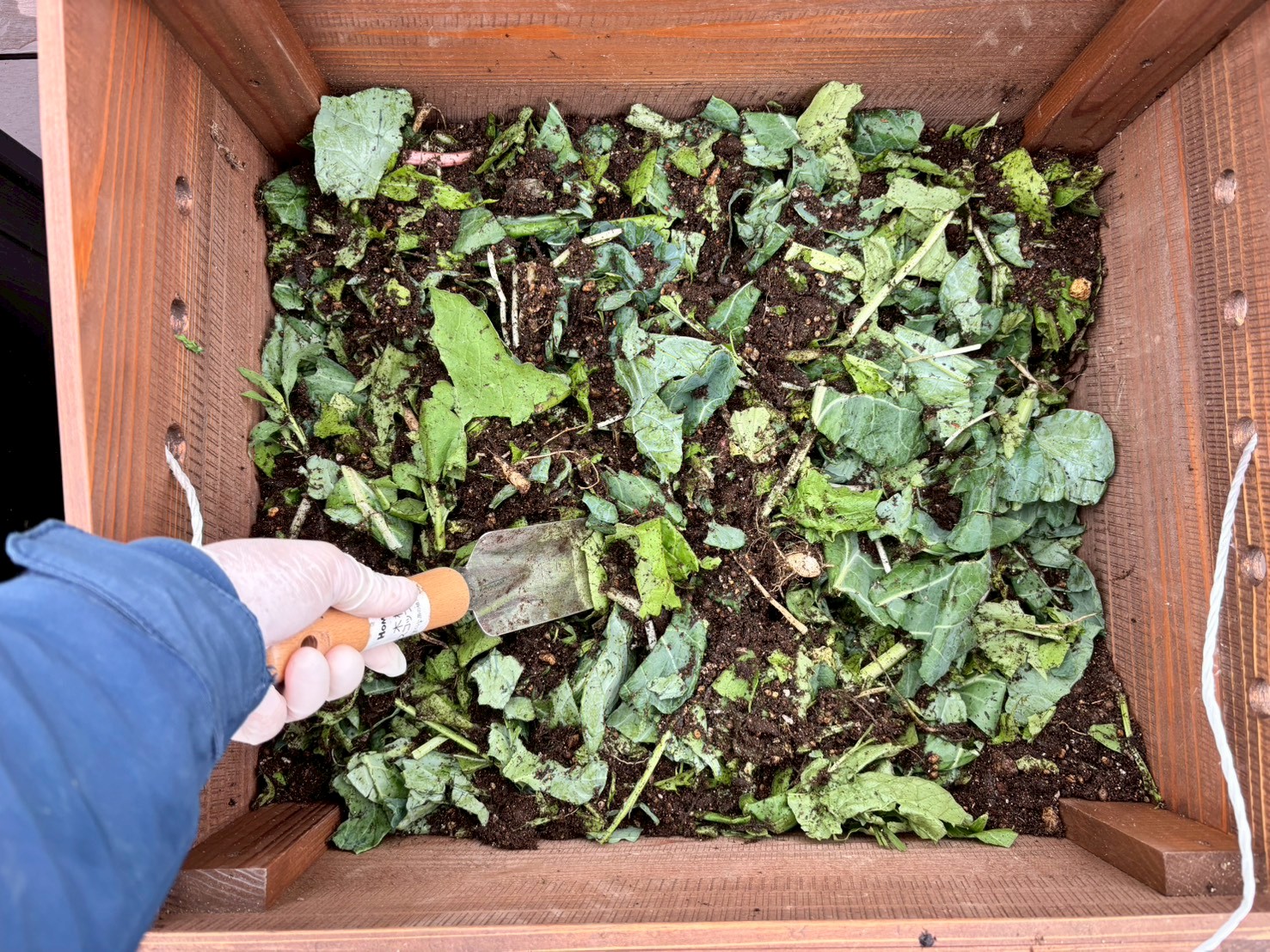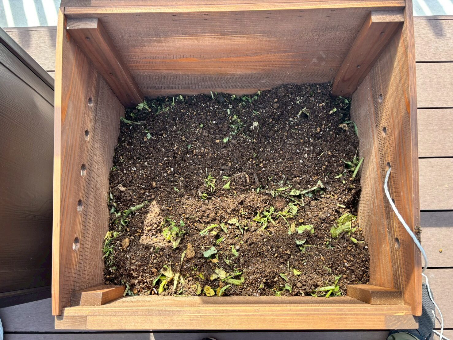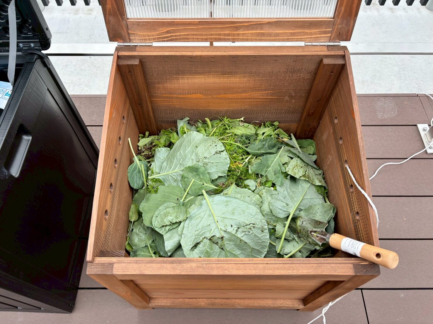 コンポストとは、野菜管理で発生した捨てて焼却するはずだった野菜の葉など使って堆肥をつくることです。焼却せず、堆肥をつくるのでとっても地球に優しくエコな取り込みです。できた堆肥は野菜管理にも使えます。