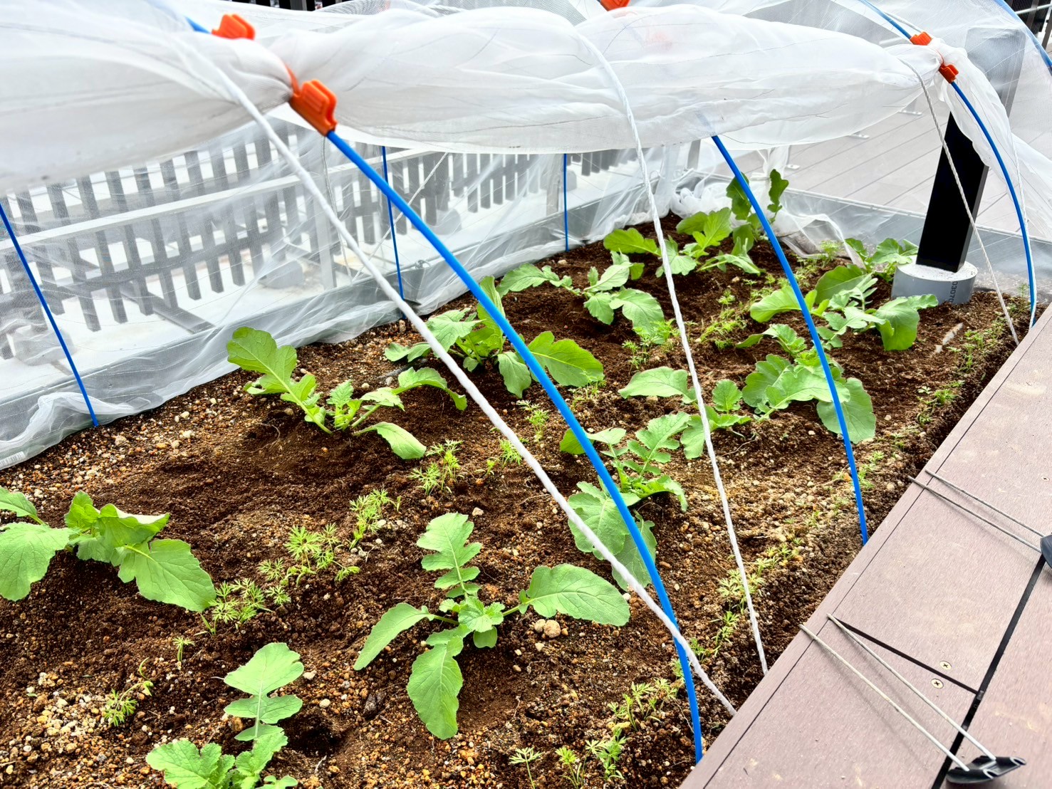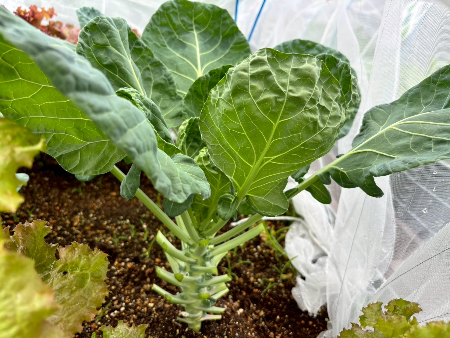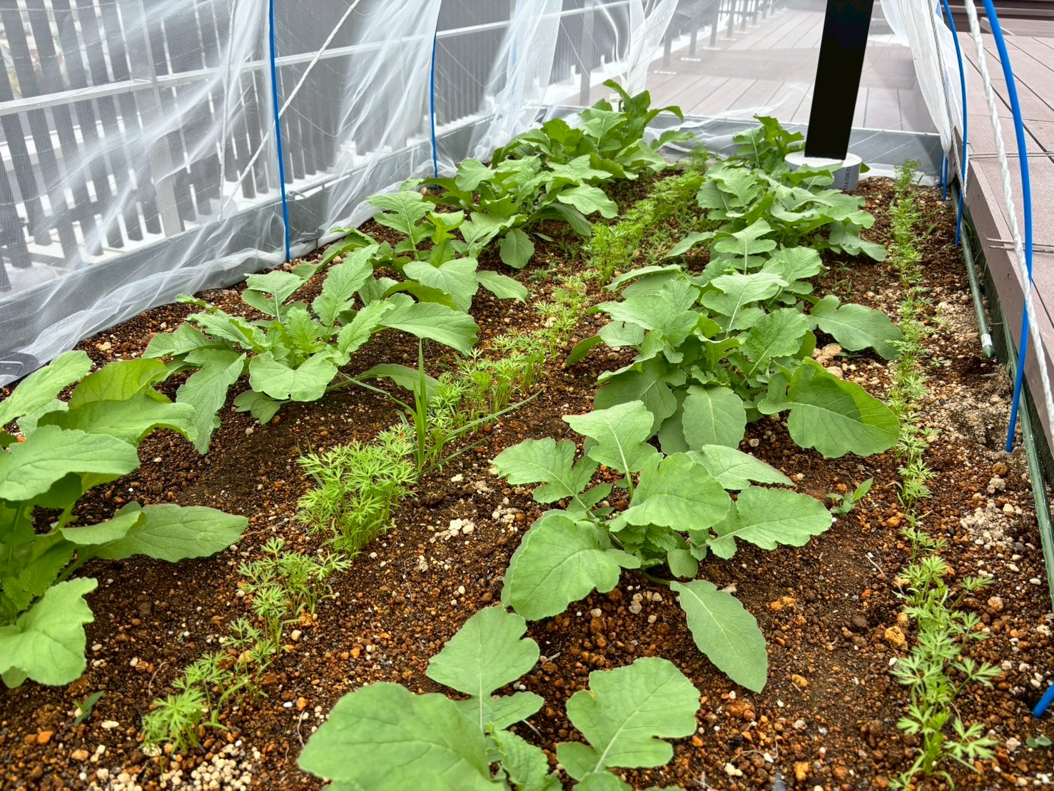 野菜を育てるうえで、野菜と野菜の間隔が大切になってきます。混みあっていると蒸れて病気が出やすくなったり、大きく育ちません。そのために、葉が混みあえば間引いたり、枯葉をとったり日々の管理が大切です。