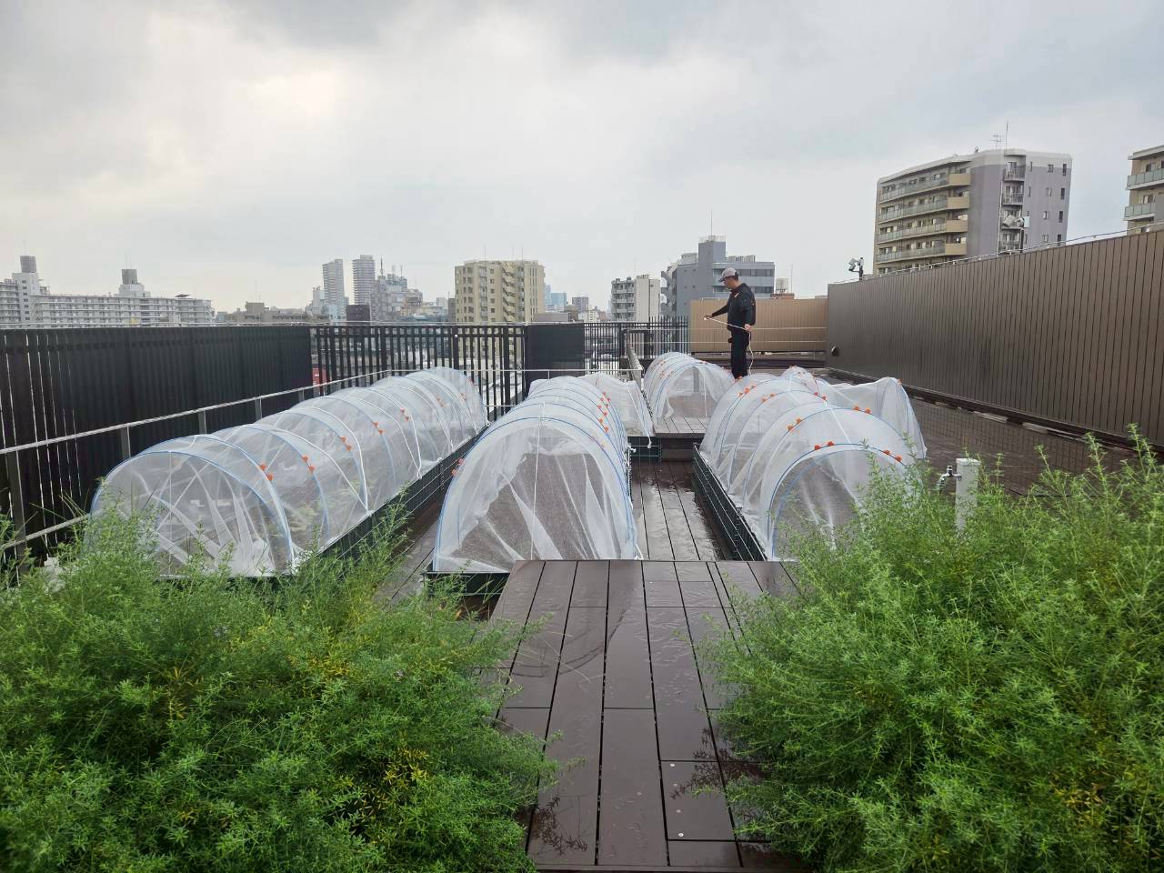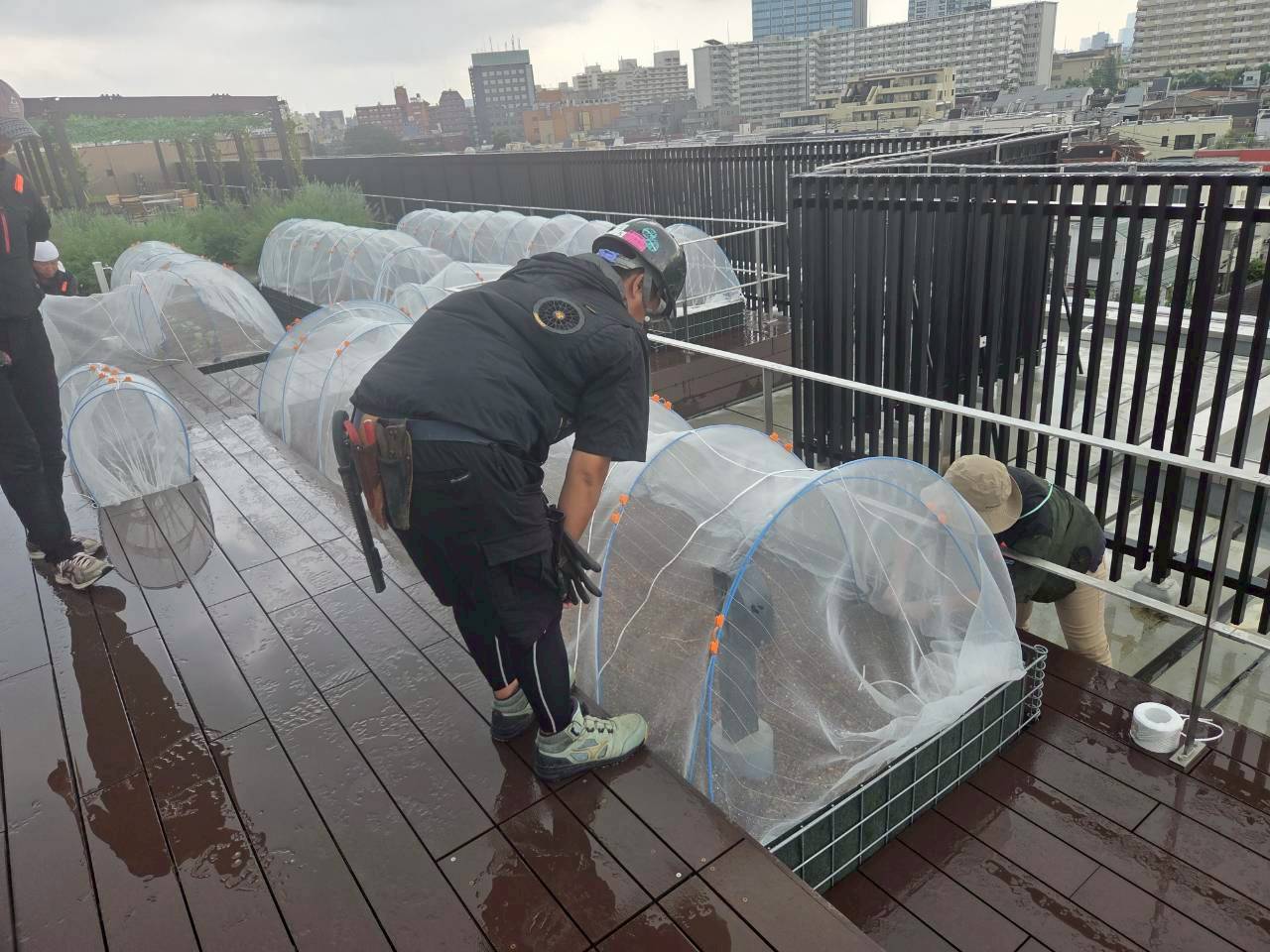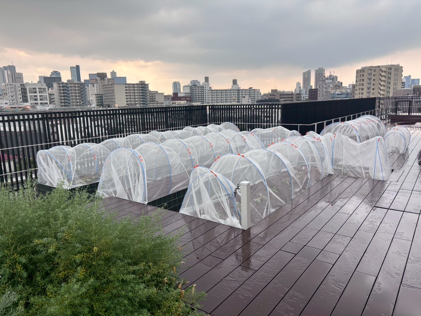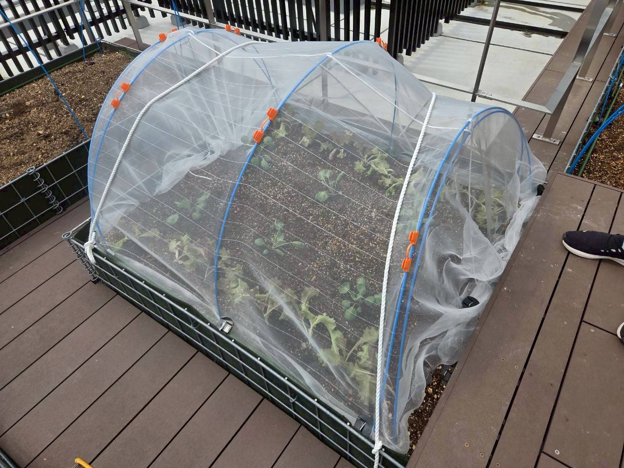 野菜が大好きな虫たちがよってこられないように防虫ネットをトンネル支柱に設置しました。これが意外と大変な作業ですが、虫に食べられないようにするために大切な作業になっています。