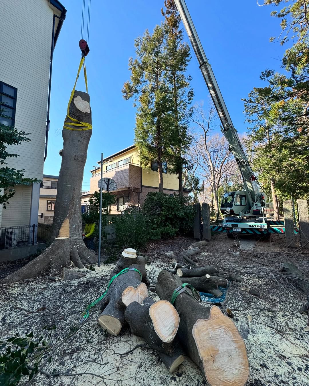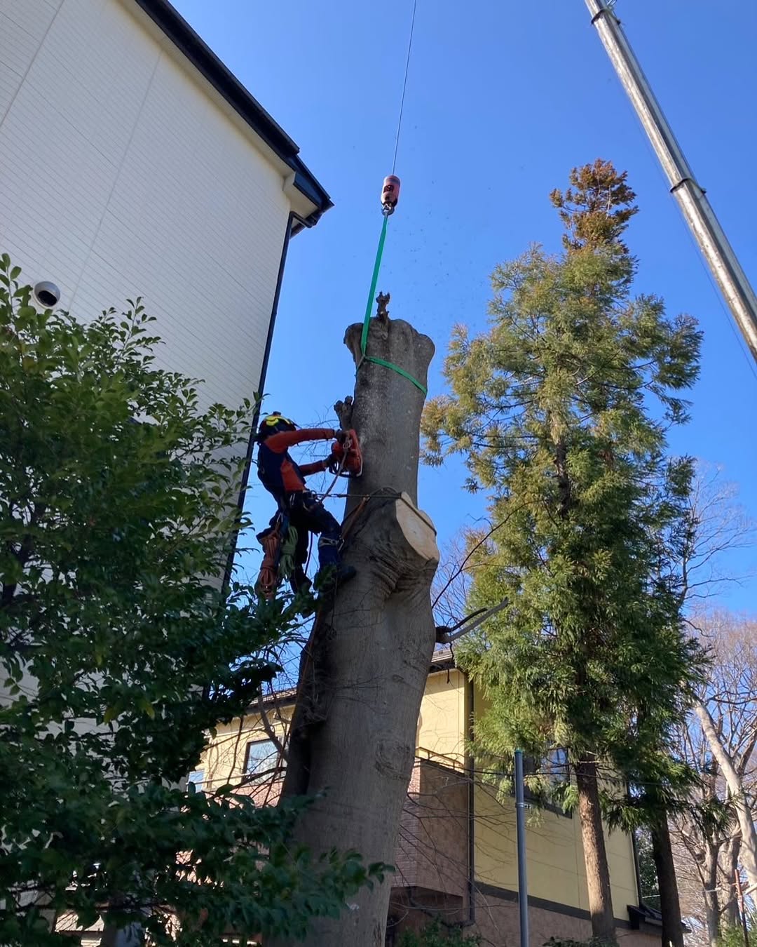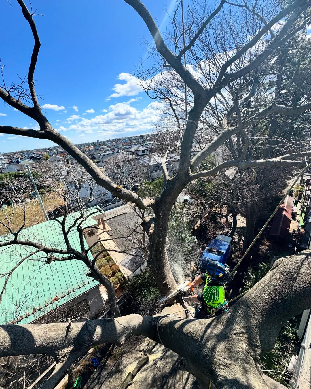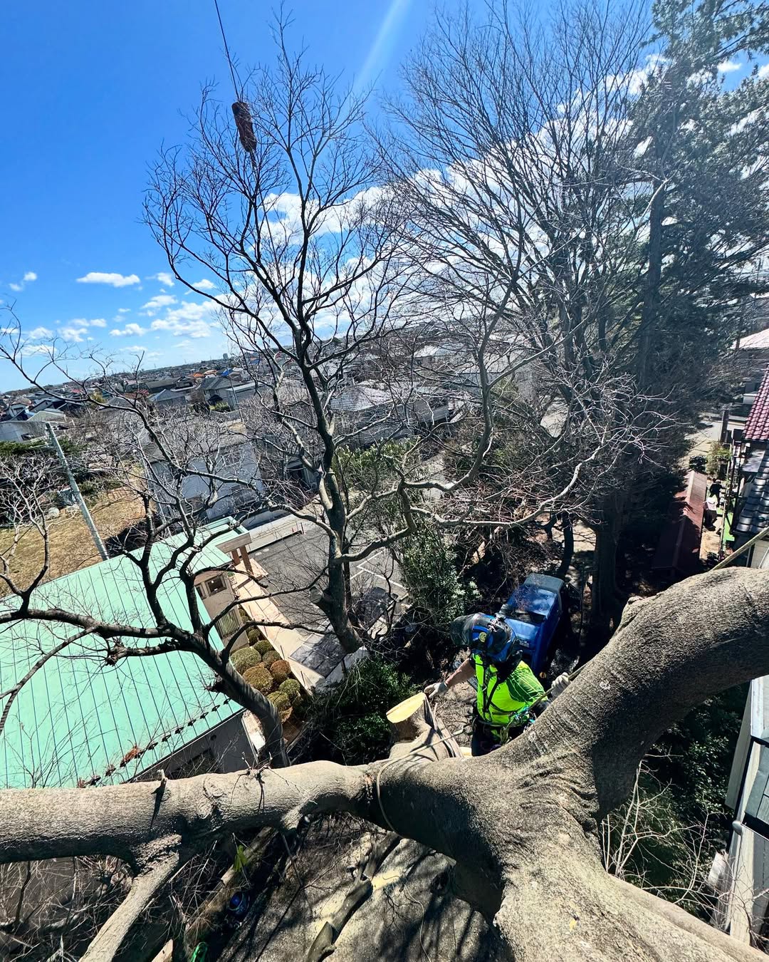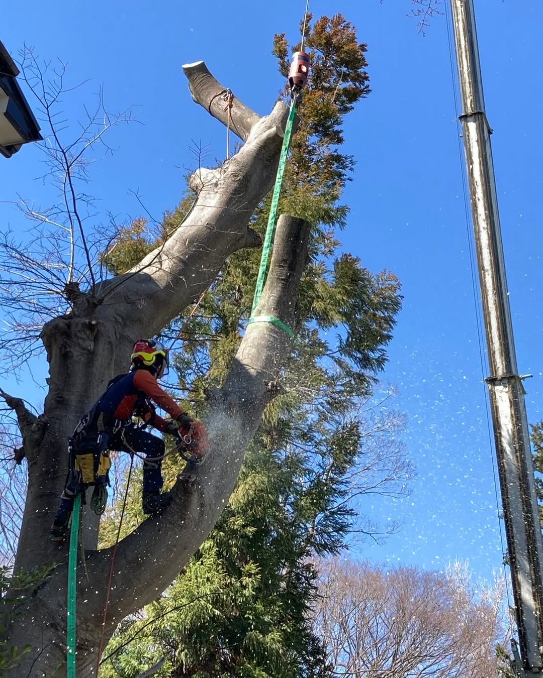 本日越谷市にてケヤキ、エノキの下までラフタークレーン使用してからの、下まで特殊伐採作業でした。(以前途中まで伐採していたため続きの作業でした) どちらの木も極太でしたが、無事に下まで切り終わりました。 この日は風が強く、インカムも聞こえづらかったですが、手で合図したり、伝達したりでやり切りました。