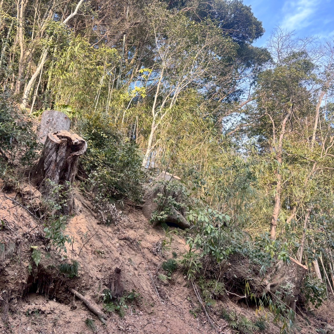 斜面地での特殊伐採作業をさせて頂きました! 重機が入らない場所では、人の技術と連携が頼りです。 一つひとつ確認しながら、 落ち着いて、丁寧に作業させていただきました。
